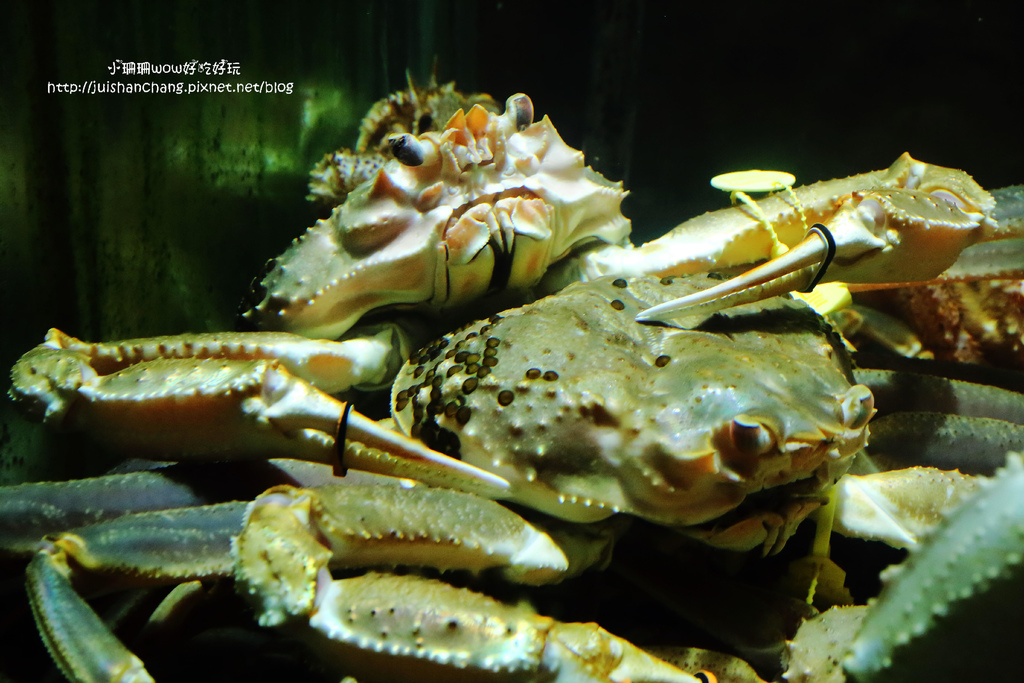 層層疊疊的大水族箱裡養著來自北海道的帝王蟹、越前蟹、間人蟹、毛蟹及本藍龍蝦等「滿箱大怪物」