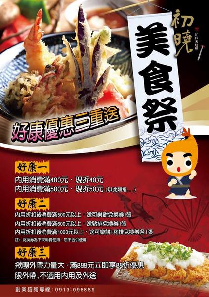 內用折扣後滿500元以上送可樂餅兌換券1張內用折扣後滿600元以上送豬排兌換券1張