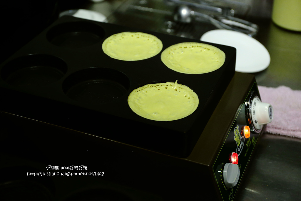朵塔燒下面的餅皮,是特製的大車輪餅模,填放烏龍茶湯鬆餅餅皮,再於上面置入不同配料