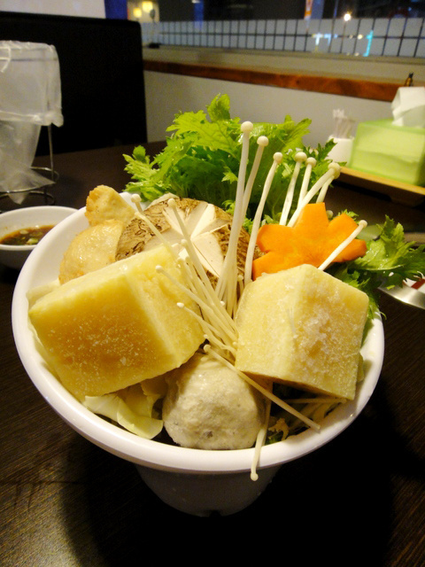 四季輕食鍋是蕃茄白菜的湯底,基本菜盤的配料有凍豆腐、香菇、魚丸、甜不辣及金針菇,乍看下和一般小火鍋很相似,但其實都較一般小火鍋健康且安全多了.