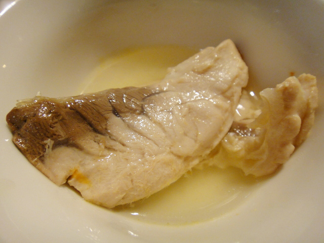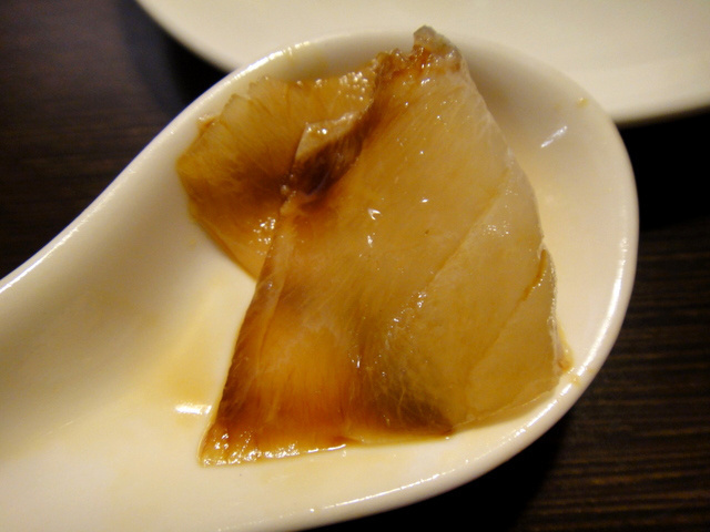 看起來有點像紅魽的烏魚細細的油脂白色均勻分布於魚肉上,看起來好可口喔~武先生剛開始要我們猜猜:這是什麼魚?吃完了才告訴我們是烏魚,讓我們好訝異喔~