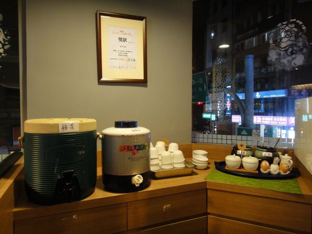 角落的自助區除了擺放著綠茶、紅棗茶讓人自由取用外,也擺放了各式的調味料讓人取用.