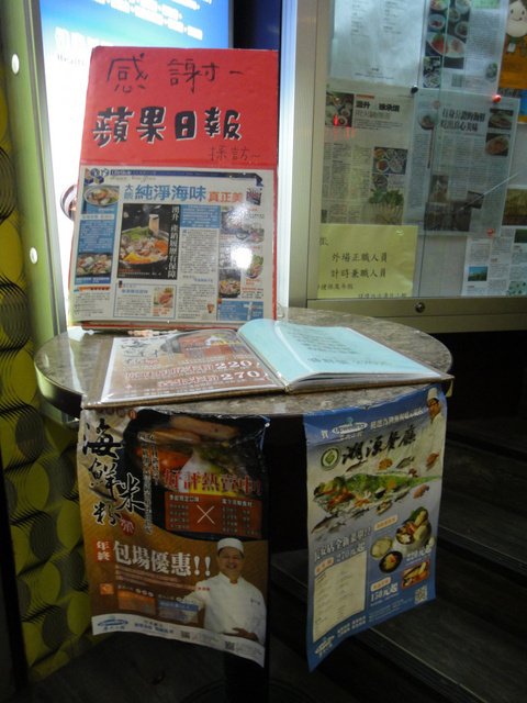 因為裡面賣的是海鮮料理,每桌的桌上都有放置裝垃圾的塑膠袋備用,除了MENU、面紙、牙籤之外,每桌都擺有年菜和年貨的宅配單.