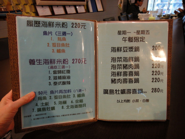 店裡平日中午還提供定食簡餐,晚上可單點或由由廚師配菜,每季共有70項不同的海鮮食材,而且餐點的價位也還算平價,是一般消費者能夠接受的範圍;MENU上的海鮮米粉感覺很不錯,在樓下的門口有瞄見DM,季節限定口味的湯底加上當令的海鮮食材,感覺養生又美味.