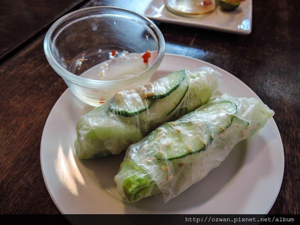 河粉料理有附兩捲生春捲,能選擇蔬菜生春捲或芋香酥脆炸春捲。