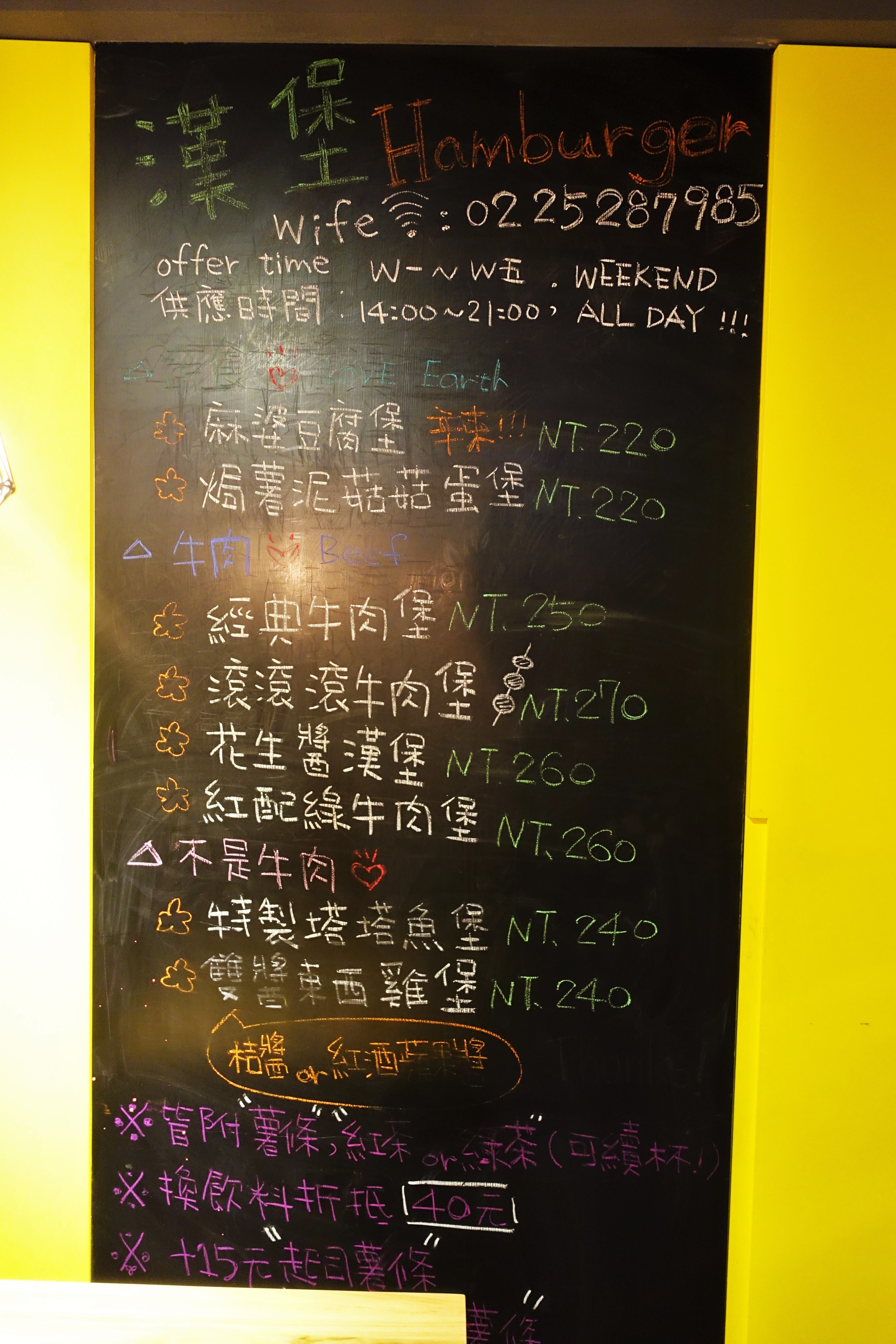 面對工作臺左側也有長形的小黑板,寫上Wifi密碼與漢堡類餐點的資訊。