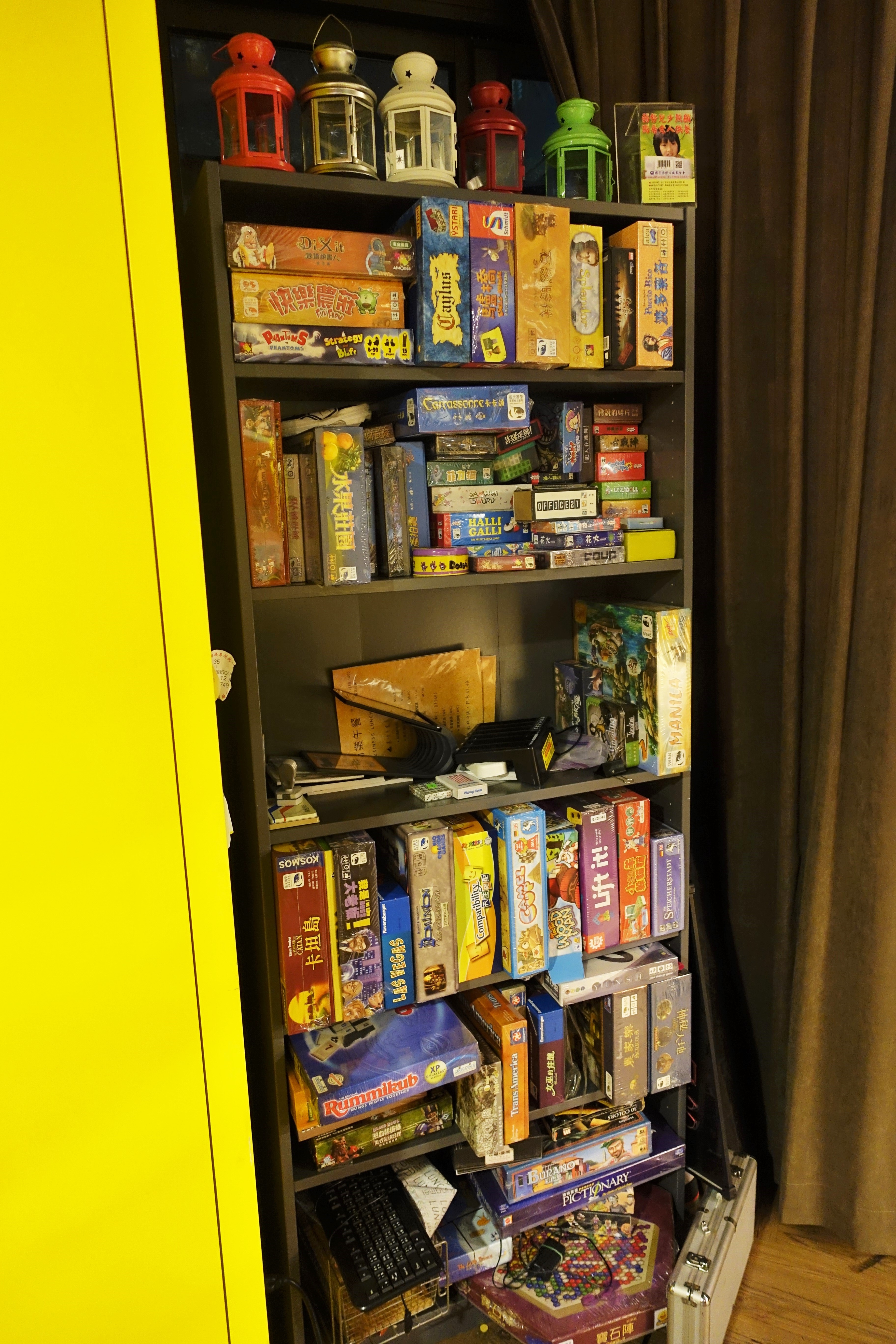 面對工作檯左側的桌遊櫃旁邊也有桌遊展示櫃。
