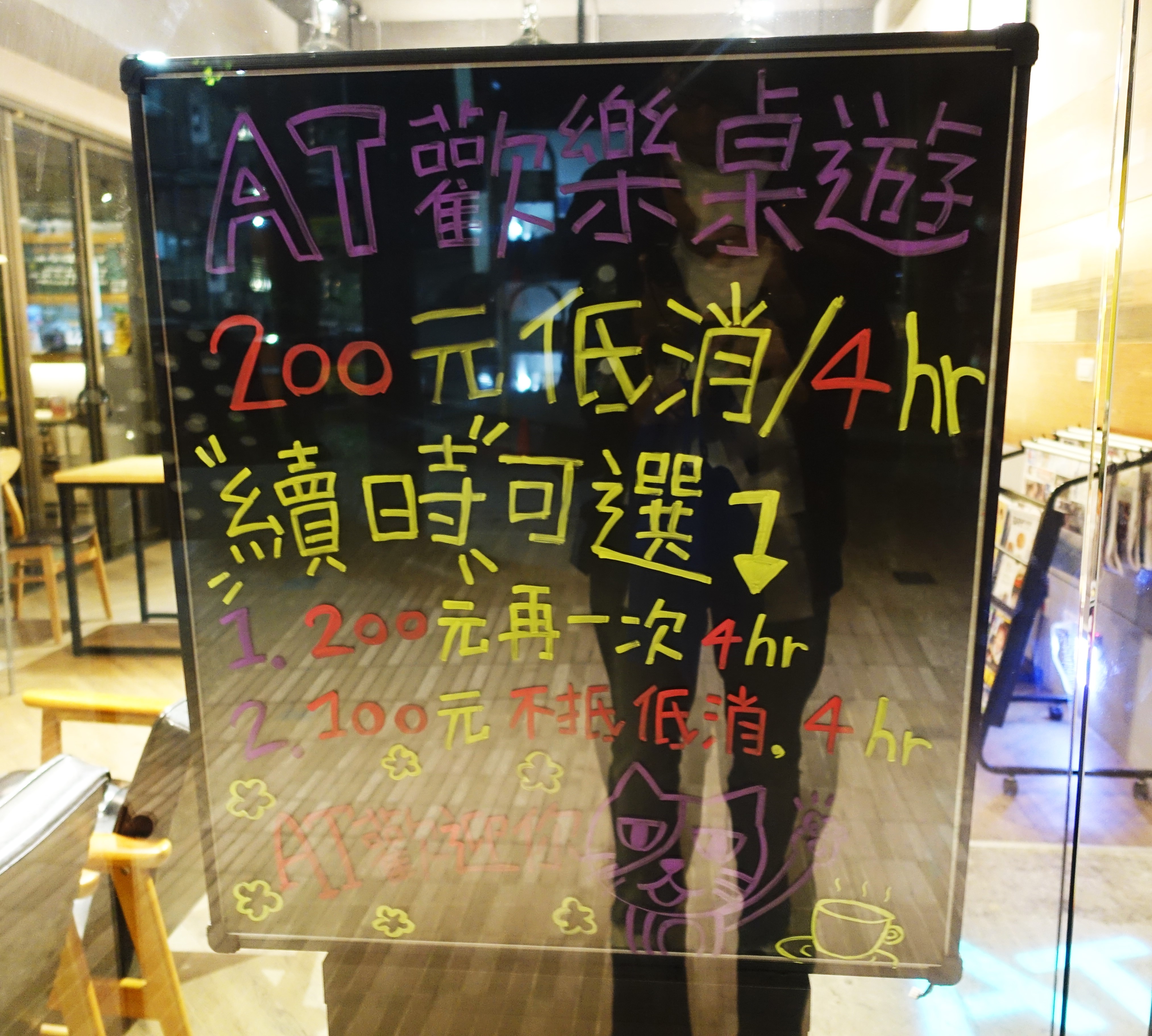 走到店門口發現AT Café有桌遊方案!!!店內暢玩桌遊的費用是:$200/4hr,如果想再續時間,可選方案為
