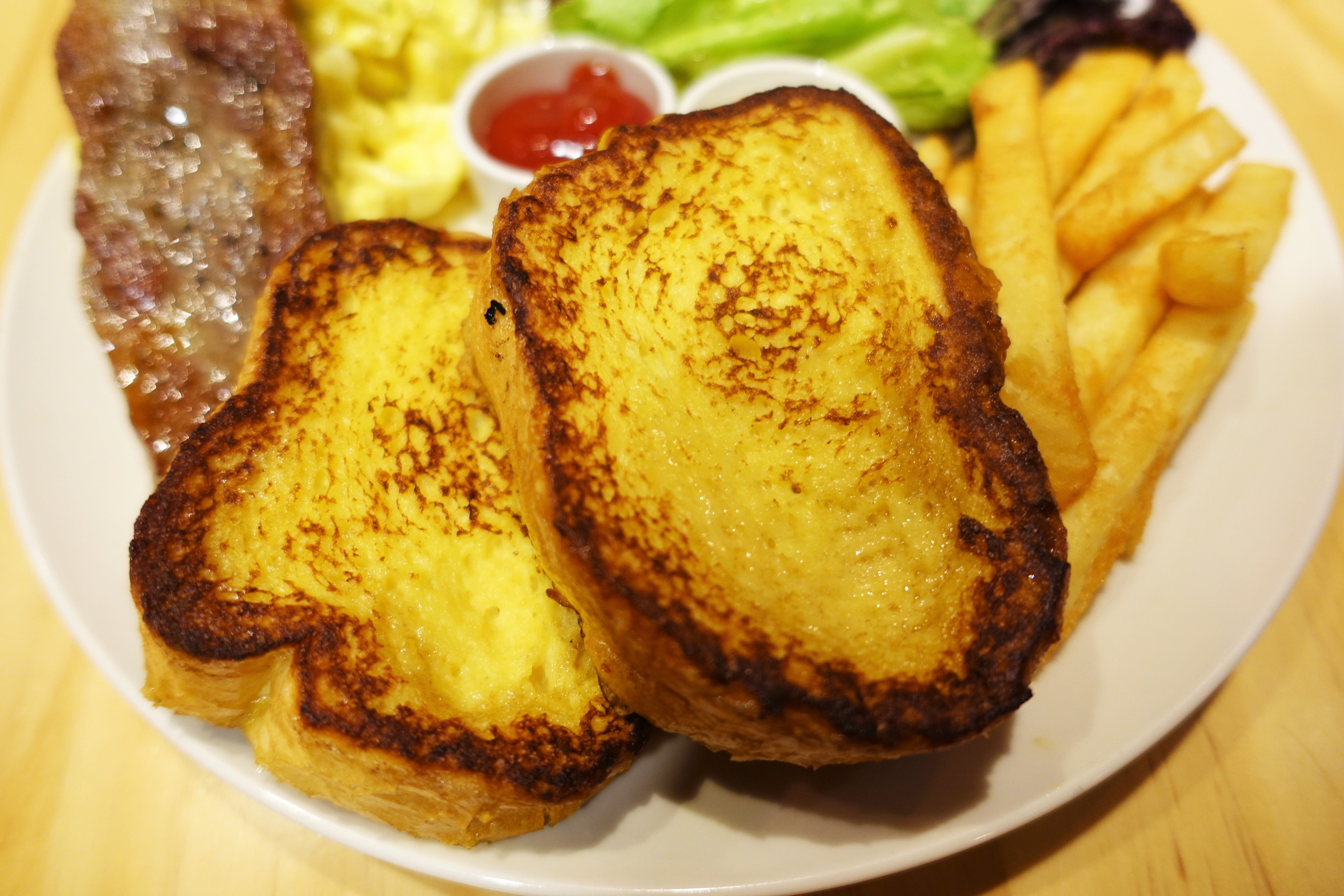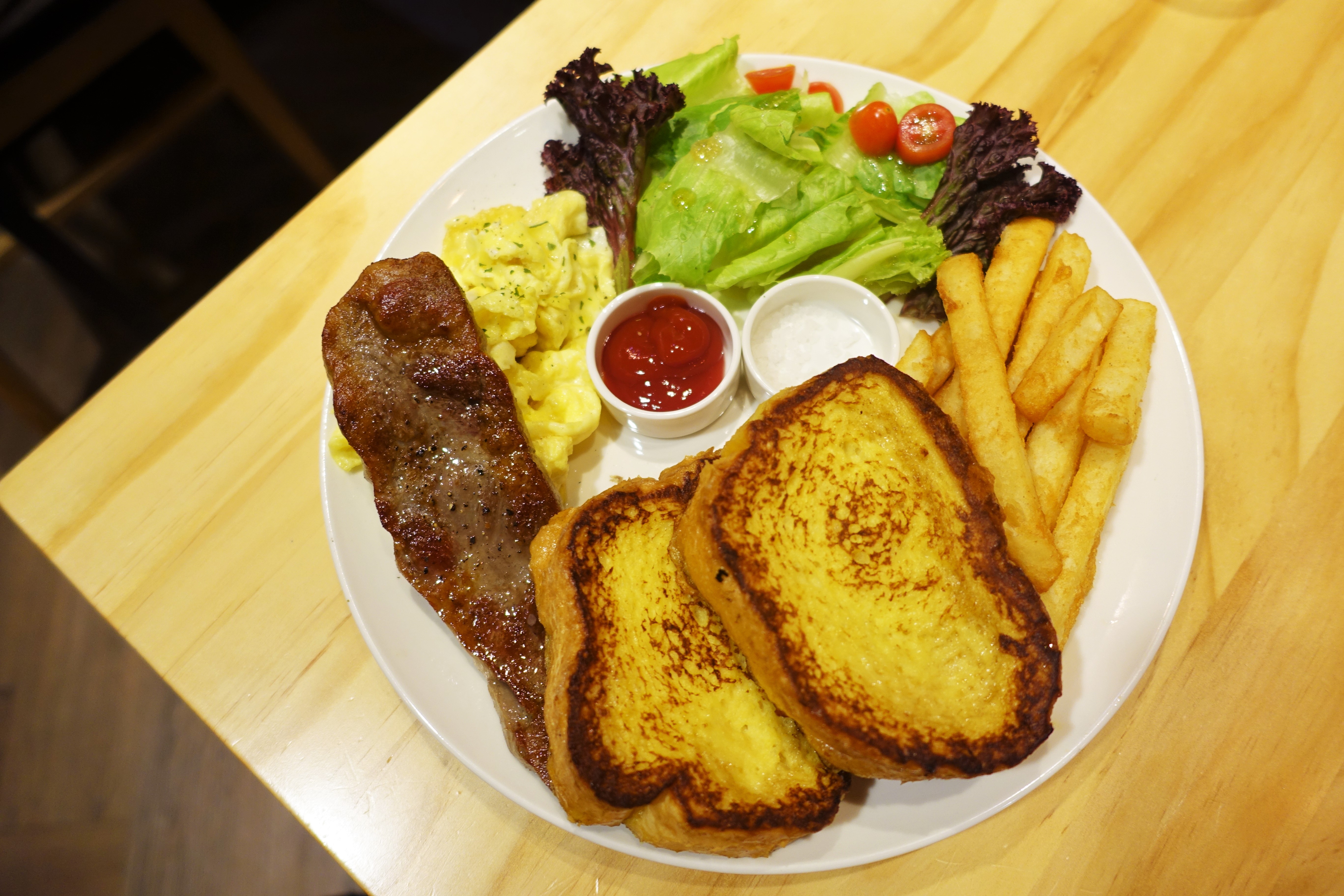 朕的早午餐有牛排、牛奶厚片(裹蛋汁)、炒蛋、生菜與薯條。