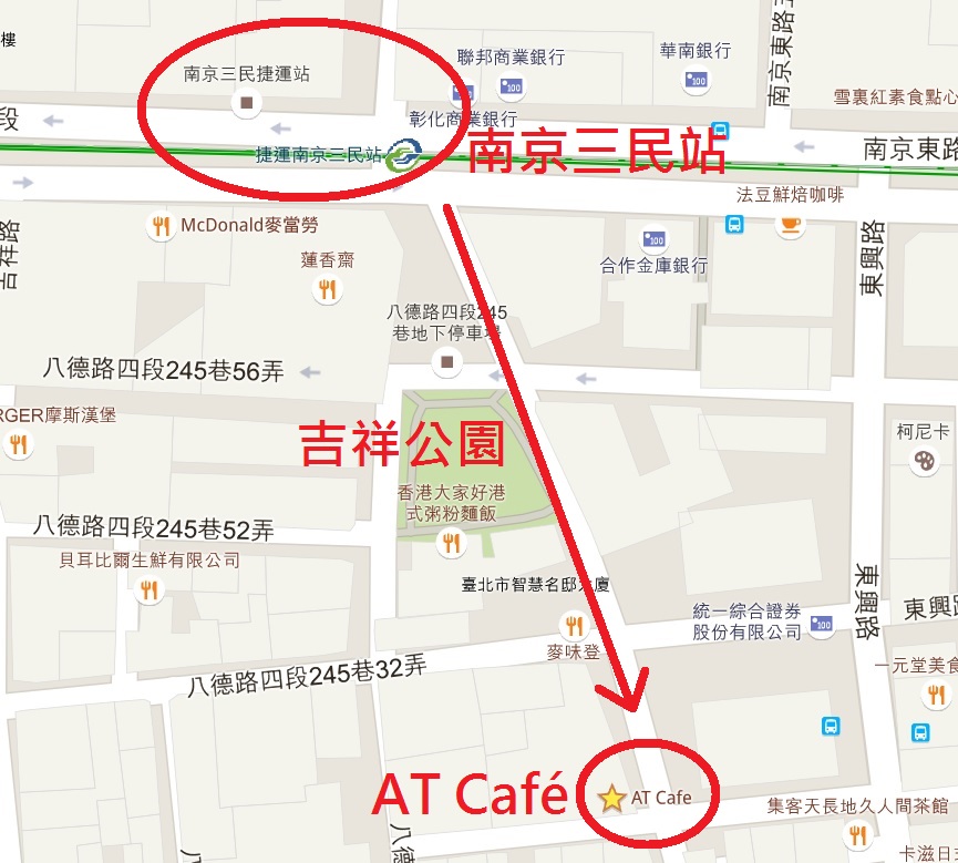 這次與前同事的聚餐約在南京三民站附近的AT Café,從捷運2號或3號出口出來,轉進八德路四段245巷(World Gym那條巷子),再步行約3分鐘即可到達。