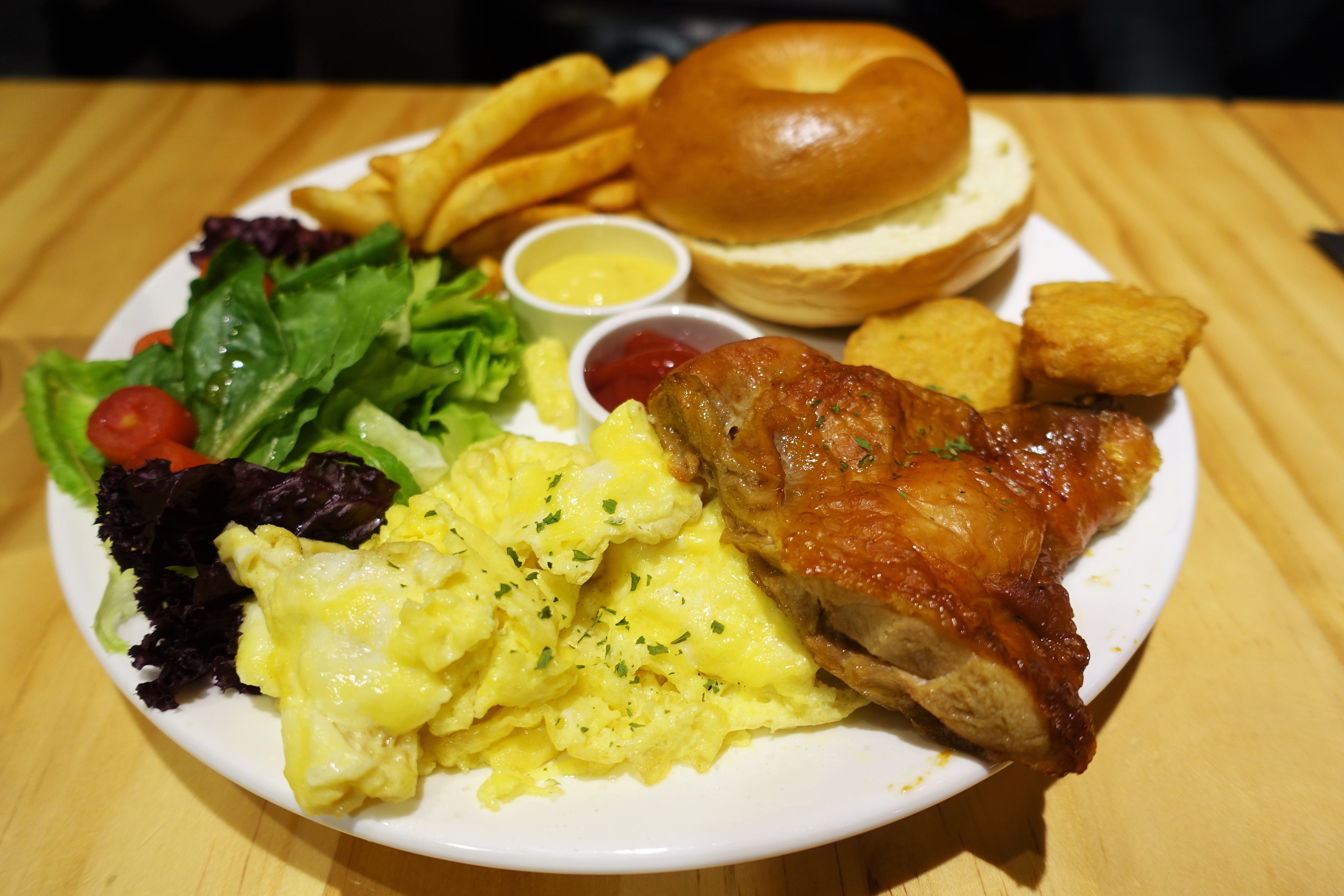 另一位朋友點的是大雞咕咕早午餐,裡面最值得一提的就是照片左上的貝果,是使用吳寶春的麵包,口感外酥內軟,吃起來相當扎實與Q彈,而且貝果的麵包體用手指壓是會回復原狀的!!!