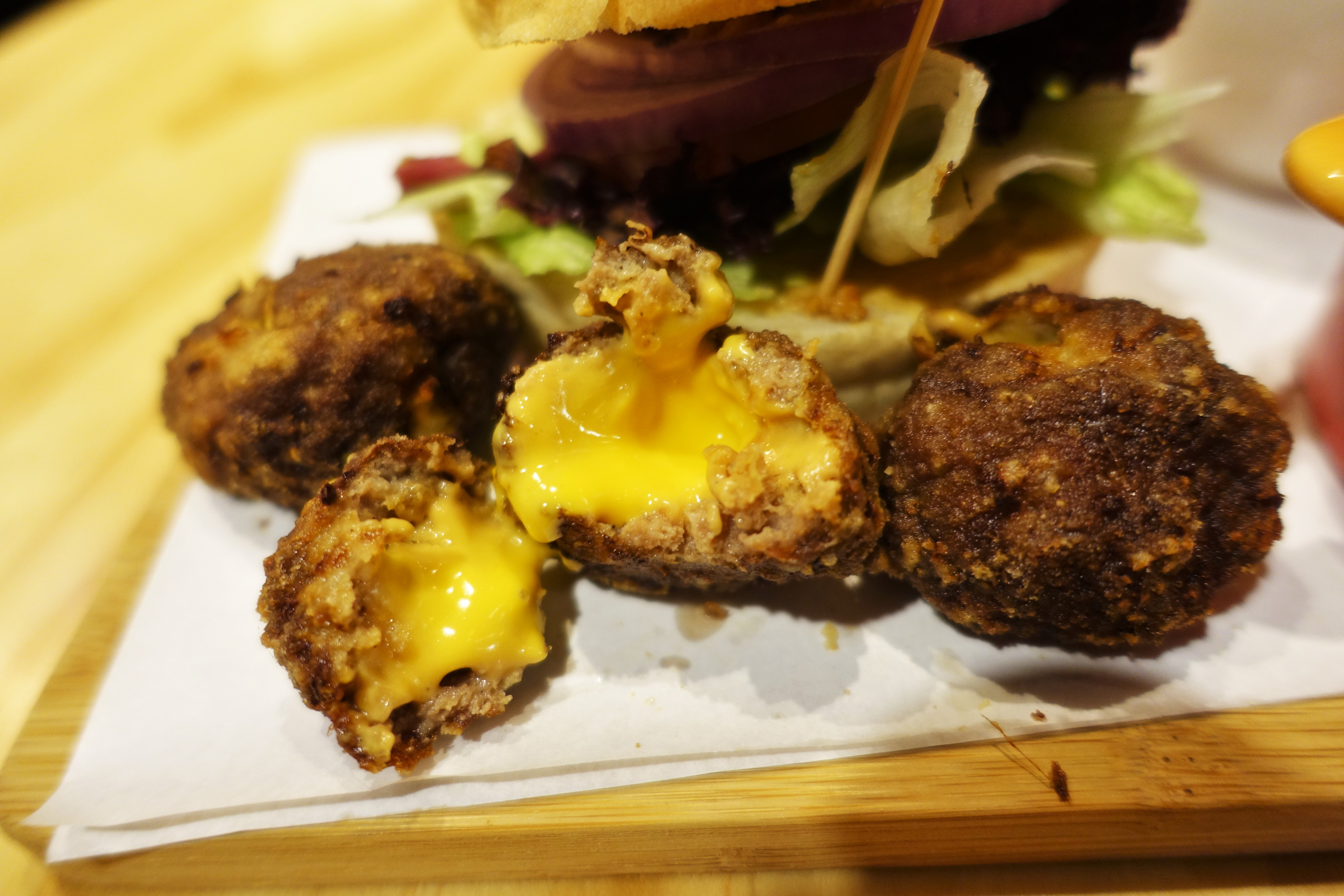大家可以看到牛肉丸裡是滿滿的起司,剛入口是起司濃郁的味道,隨著咀嚼牛肉的甜味會跑出來,如果再搭配漢堡與生菜一起吃,層次應該可以更豐富,可惜哥忘了...囧rz...