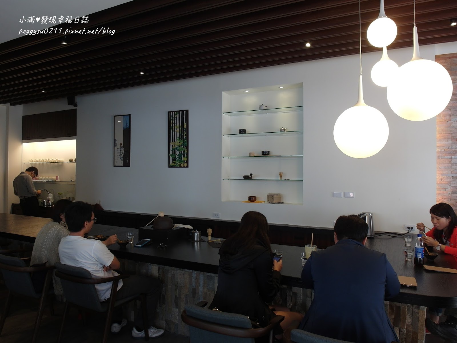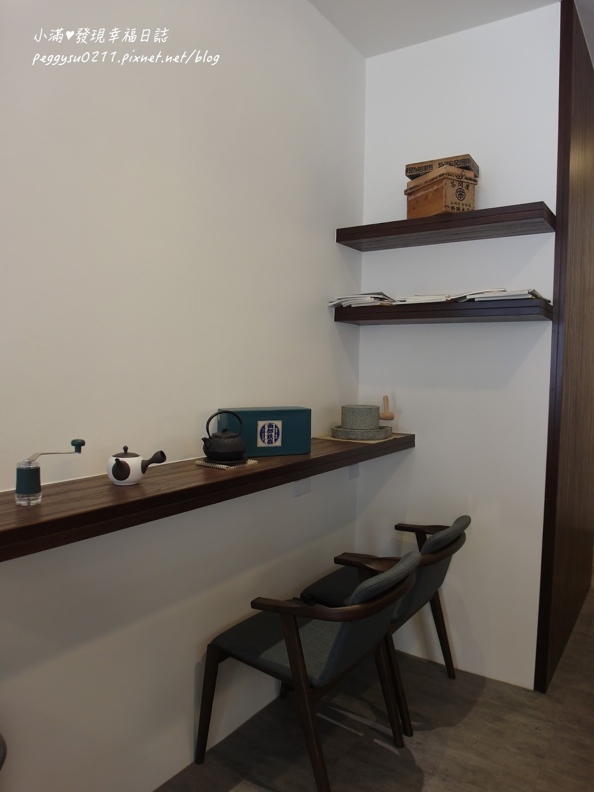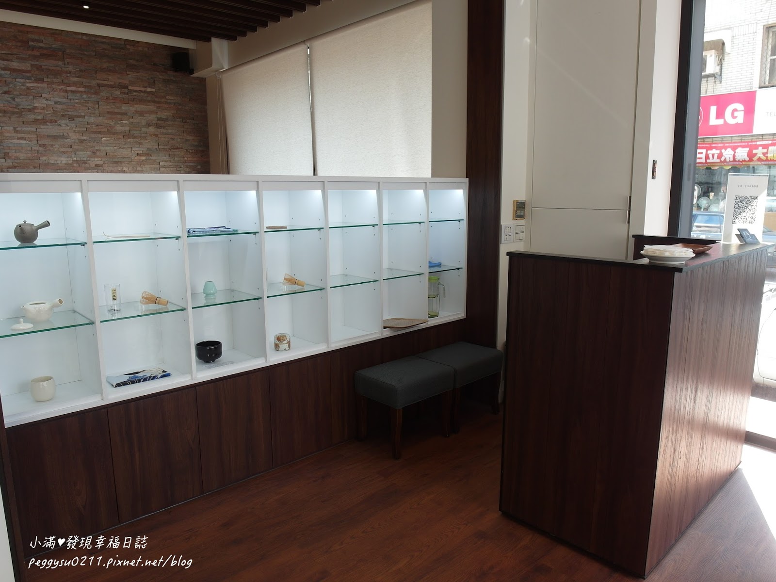店裡也是走日式現代簡約風格,櫃檯後方的方格櫃中擺放許多茶具