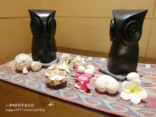 看到雞蛋花(梔子花)跟貓頭鷹木雕,又充滿南洋風情