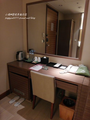 下面的照片是書桌,桌上有茶包、礦泉水、吹風機,下方有小冰箱跟拖鞋