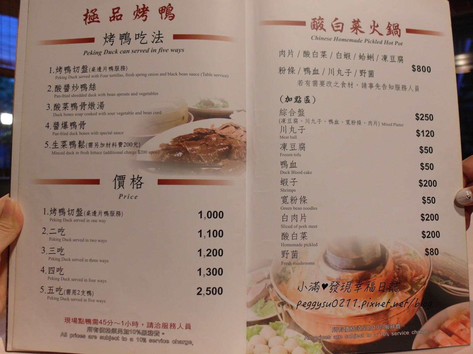 烤鴨切片、酸菜鴨骨燉湯、生菜鴨鬆(需加價200元)
