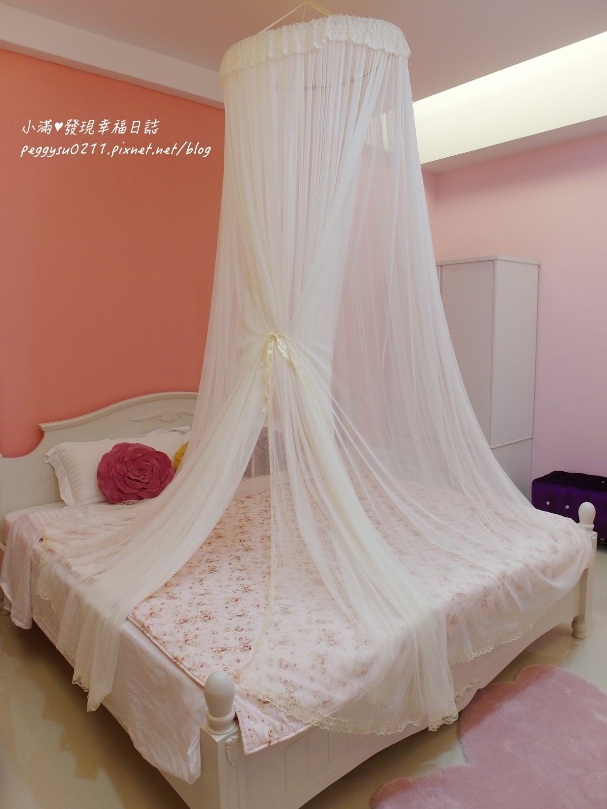 簡單的玫瑰粉色牆面,搭配純白的絲質紗帳,簡直就是公主的閨房