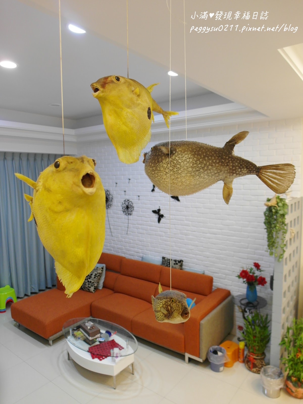 樓梯旁的天花板懸弔幾隻河豚標本是最特別的裝飾