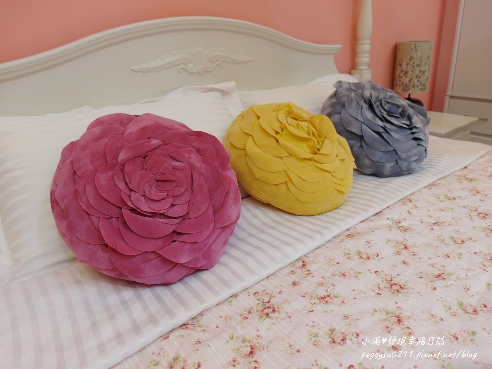 玫瑰小花的床單小滿超級喜歡>////< 床上還擺了三種顏色的玫瑰造型抱枕