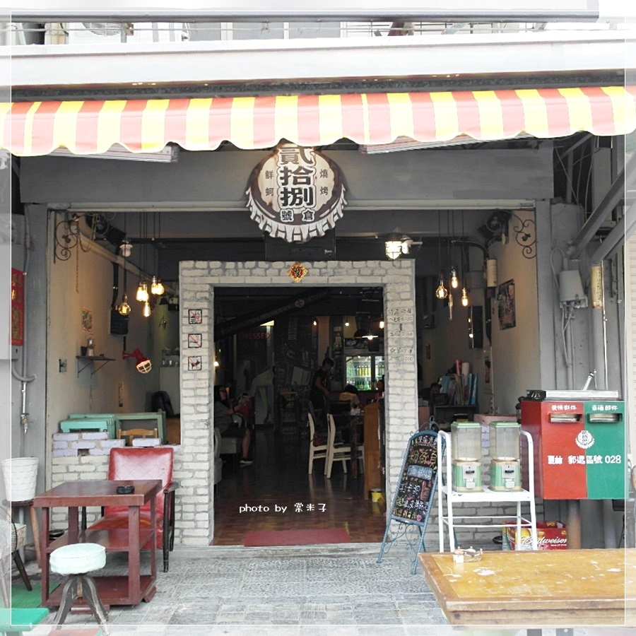 "貳拾捌號倉鮮蚵燒烤"的店門口以灰色磚塊半牆面區別出店內和店外,
