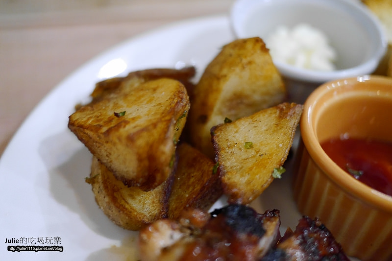 ↑雞腿排的部分煎烤的很恰當,肉汁都還留著,表皮帶點焦香味,很可惜沒有做到脆皮,不然我會更愛。