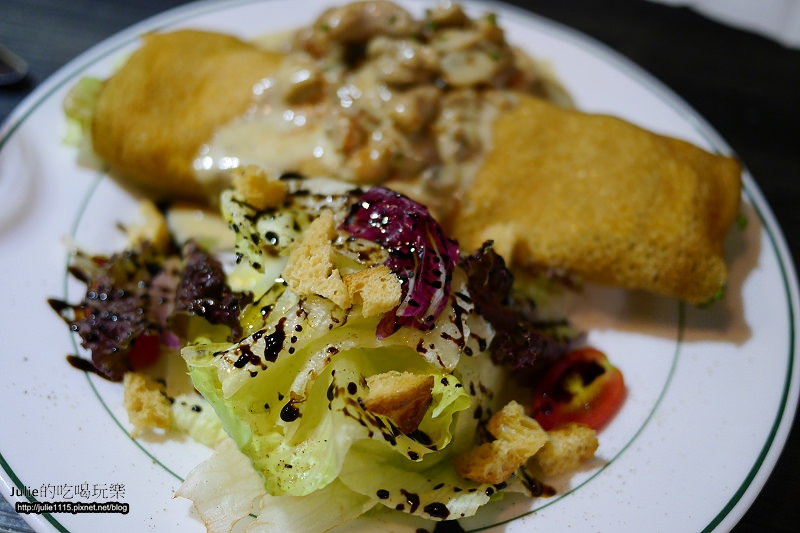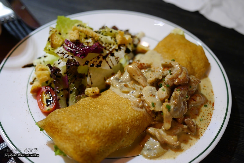 ↑薄餅的部份裡面好像包了生菜跟起司,然後搭配上蘑菇跟雞肉煮的醬汁。