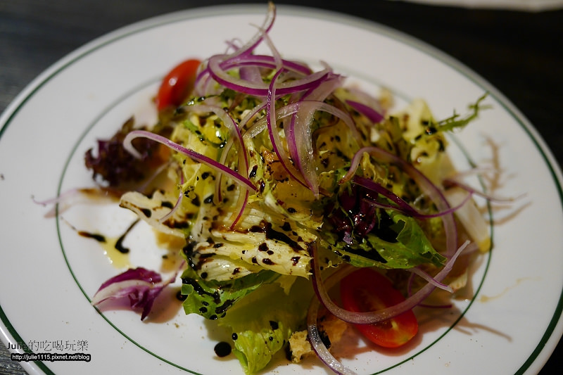 新鮮的生菜搭配上洋蔥絲、番茄,簡單的灑上橄欖油跟濃縮義大利醋。