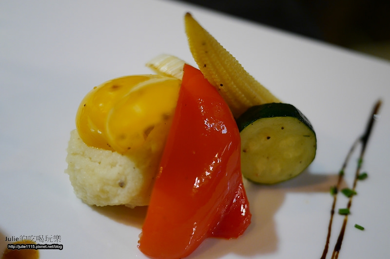 ↑旁邊搭配的配菜顏色非常的漂亮,有紅、黃椒、節瓜、玉米筍跟馬鈴薯泥?