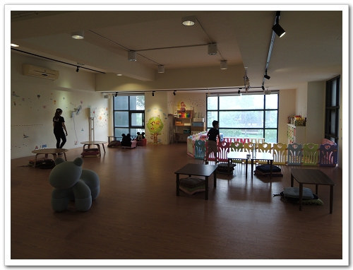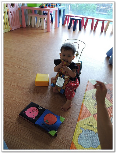 遊戲區全貌,有寶寶爬行地墊、桌子椅子、盒子裡有提供一些玩具,像是積木,不過種類並沒有很多。(我上網看其他網友的照片,顯示~經營了有一段時間的親子餐廳,玩具的耗損真的很高啊!)