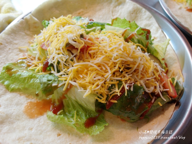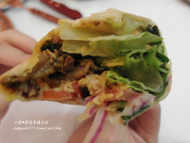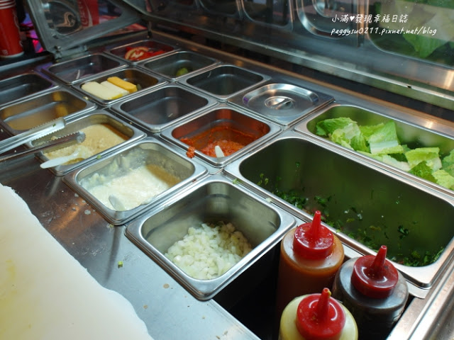 裡頭包的配料非常豐富,有蕃茄、洋蔥、酸黃瓜、起司、蘿蔓、墨西哥辣椒