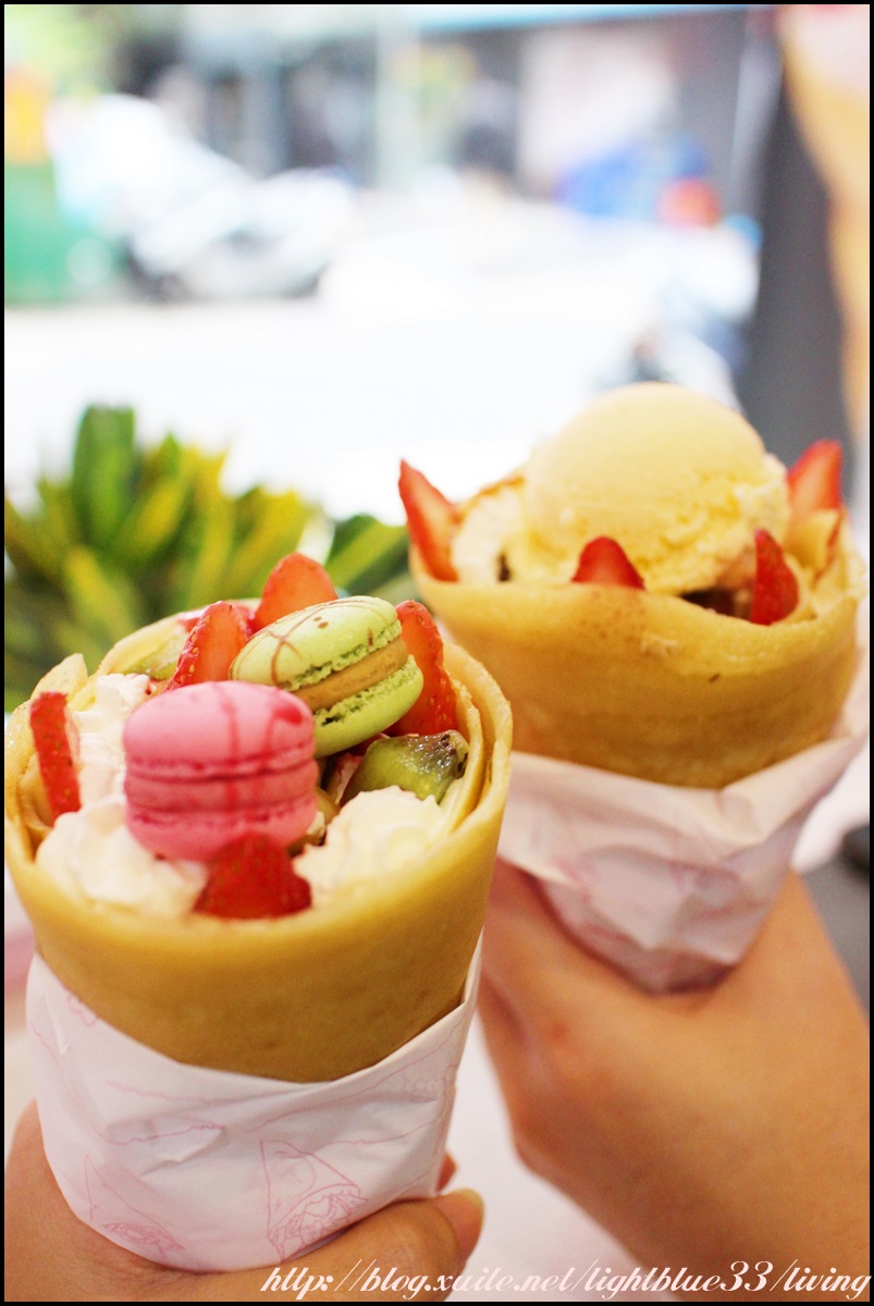 可麗餅製作好之後,會先用經過設計的紙盒擺放上桌,而且店員還會詢問有沒有要拍照,等你拍照完之後,除了把紙盒拿走,竟然還會主動幫忙把外頭捲的紙往外折好交到你手上方便食用,還會把衛生紙拿過來問有沒有需要,超貼心的啦!