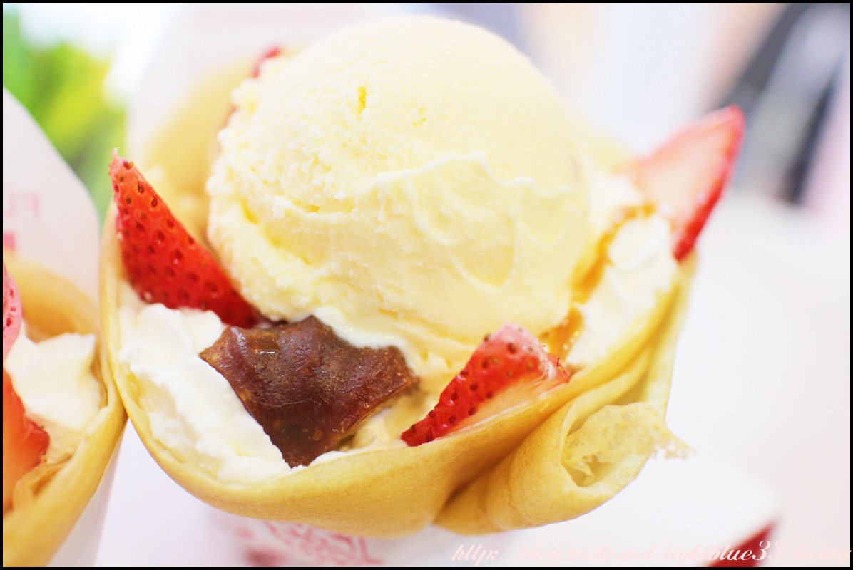 草莓焦糖可麗露除了有好吃的草莓跟鮮奶油之外,還有一整顆的可麗露,而且這可麗露個頭還不小,都已經切成四等分擺進可麗餅了,但是每一塊都不會一口就吃光,大概可以咬個兩三口,吃起來外皮並不會太硬,而內層更是讓人驚喜的彈牙口感,跟柔軟的可麗餅皮形成不同層次但又完全不突兀的口感,如果有單賣可麗露的話我也想買!加20元點的冰淇淋是明治的香草冰淇淋,份量非常有誠意,值得!