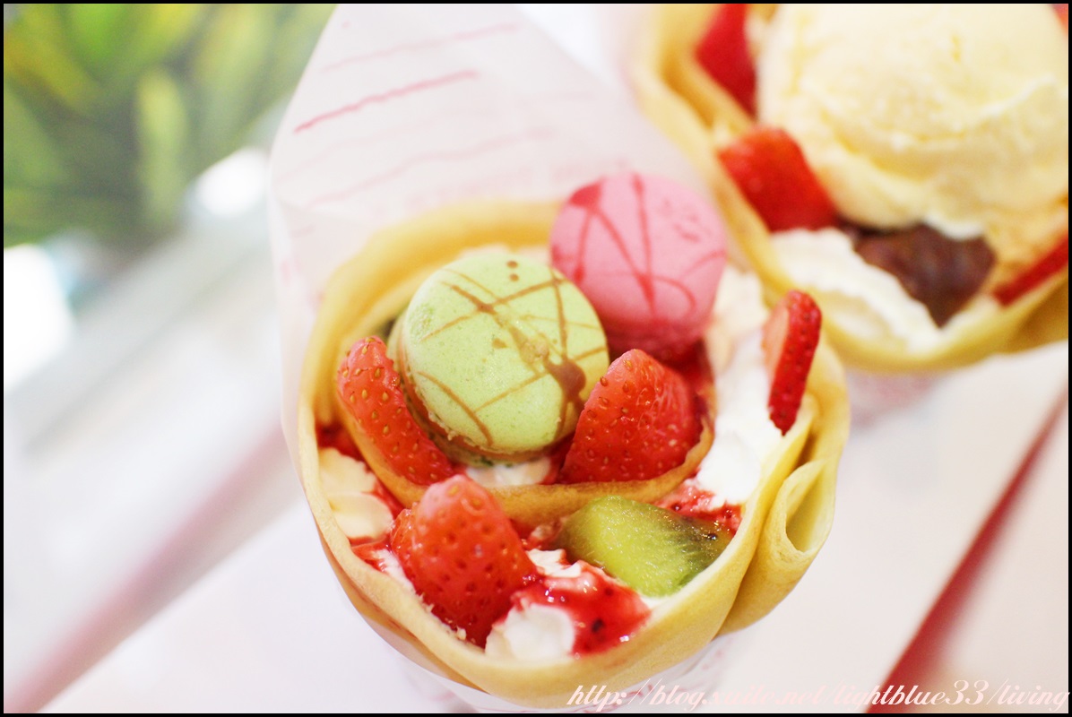 馬卡龍圓舞曲有草莓、鮮奶油、奇異果,所以吃起來酸酸甜甜的,配色也是很聖誕節的紅配綠XD原本馬卡龍圓舞曲會有一顆馬卡龍,我又加價點了一顆,超滿足~~