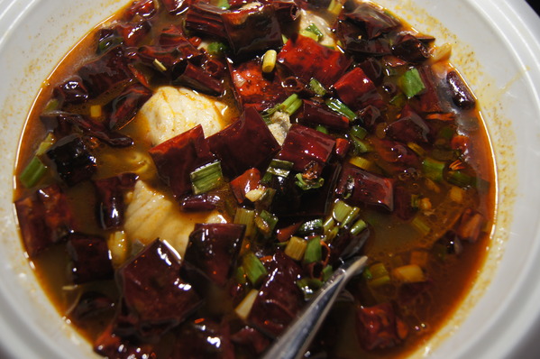 這是一道四川菜,承襲道地四川水煮魚的料理特色,使用辛而不嗆的麻辣湯底與海鱸魚一起燒製而成。