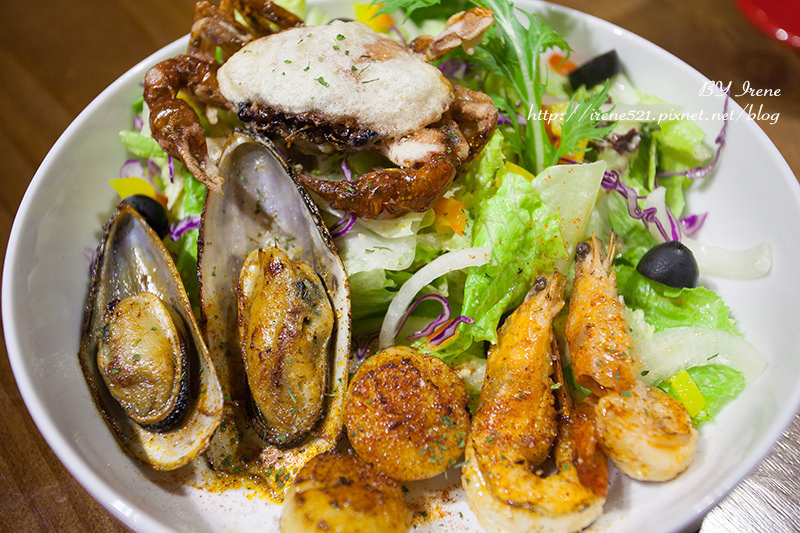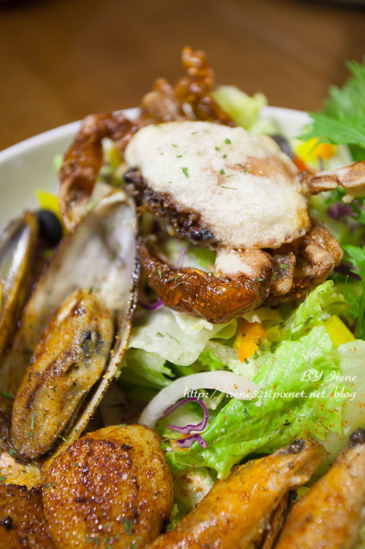 低調奢華的「海鮮總匯沙拉」(NT.450),軟殻蟹、淡菜、鮮蝦、干貝等海鮮與生菜所組成,