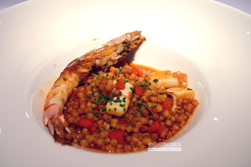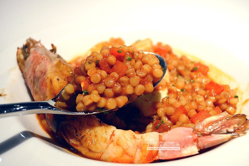 ▼醬汁是用螃蟹熬的,味道略鹹了些,聽店員說以前是用雞高湯做的味道更濃,就有客人反應太鹹了~後來才開始慢慢的調整! 不過安魯魯吃過的正統義大利菜也都是重鹹的,早知道這道菜有調整過,應該先跟廚師反應一下,用他們原本的做法煮來吃吃看才對! 天使紅蝦吃起來肉還滿鮮甜的~其實用天使紅蝦入菜就知道這道米麵的味道一定是很濃郁的!