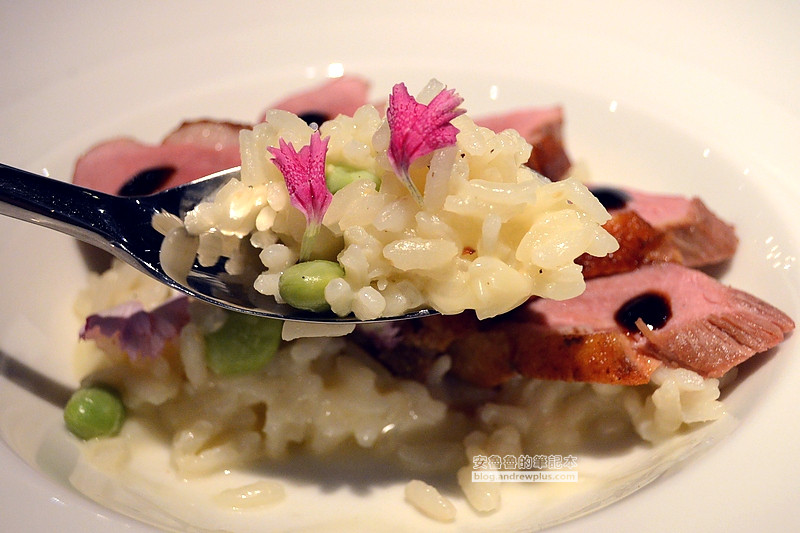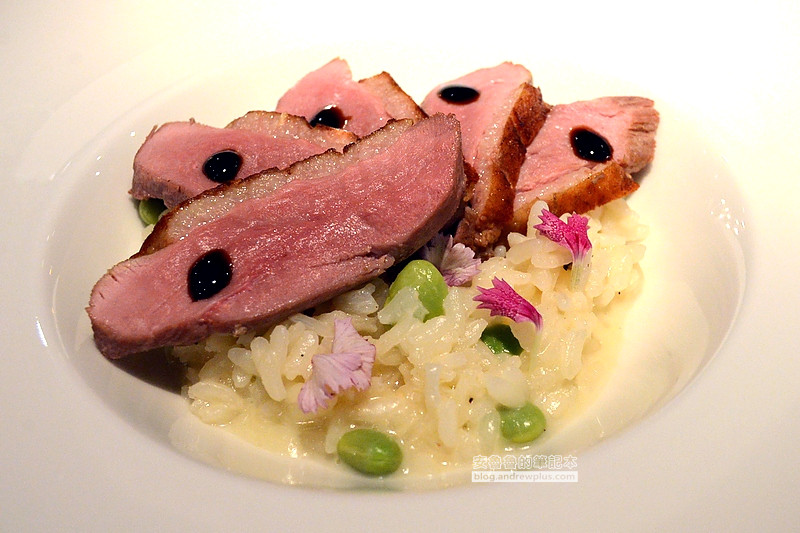 0.5cm厚鴨胸肉經過低溫烹調,變的超軟嫩佐起司白醬及義大利米飯加上毛豆點綴,入口有明顯的香甜氣味,這是安魯魯今年吃過最好吃的一道燉飯了! 從來沒吃過這麼軟嫩的鴨胸,吃起來的口感接近5分熟的牛排,卻沒有生肉的感覺~搭配梅子醬和那一層香脆的鴨皮~軟嫩中帶著油脂的香氣~超棒的!