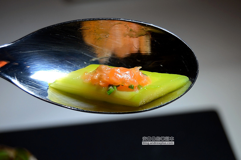 ▼軟嫩的蘆筍搭配生鮭魚的鮭魚蘆筍,蘆筍上挖了一個凹洞,擺上了燻鮭魚,在鮭魚和蘆筍之間沾著一些香草佐料,第一道小菜就看得出主廚的刀工了得~不過這個蘆筍Size實在有點小~我的大口一咬~咕嚕一聲~娃~~就被我吞進去了!哈~