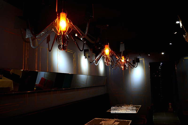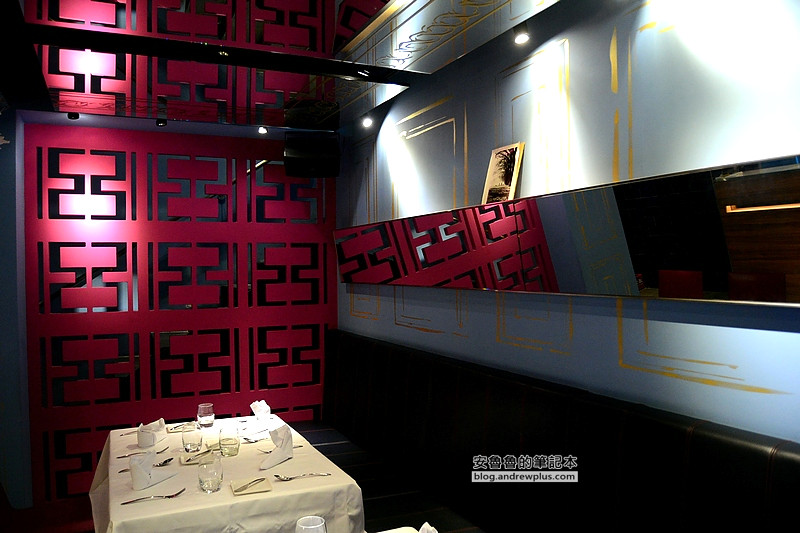 ▼裝潢設計還頗前衛的,藍色的牆面畫上金色的方框線條,在燈光的照射下會有立體飾紋的錯覺