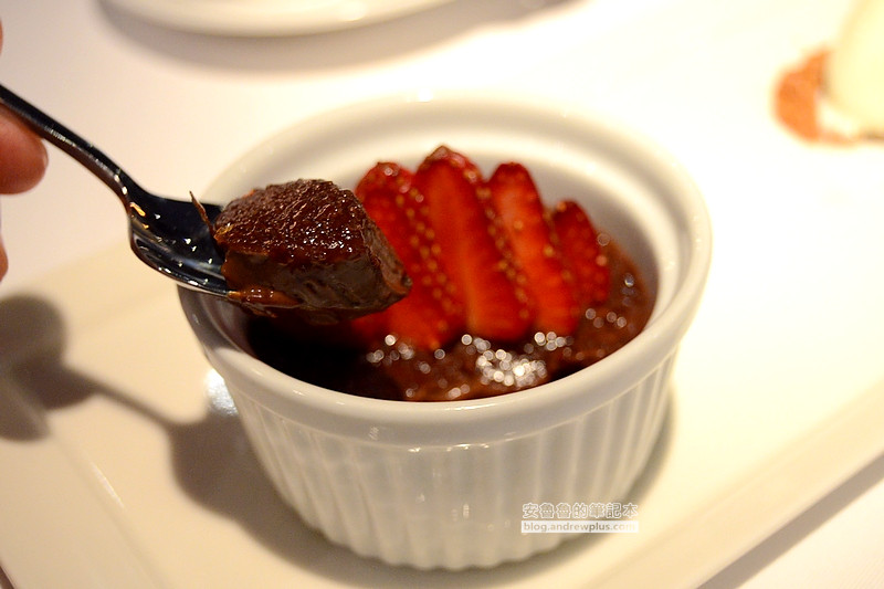 和印象中的烤布蕾完全不同,口感比較像是滑順的奶酪,帶點苦甜的巧克力和微酸的草莓切片,這道甜點就很對螞蟻人安魯魯的胃~因為它夠甜! 哈哈~