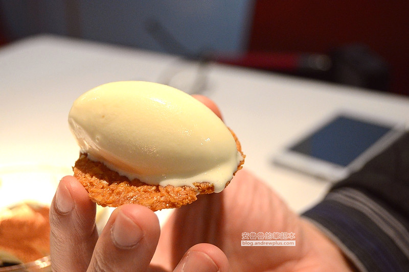 ▼香草冰淇淋看起來好像蛋糕唷~那就把它當蛋糕一口一口咬好了~下面的脆餅也是甜的~咬起來口感不錯!