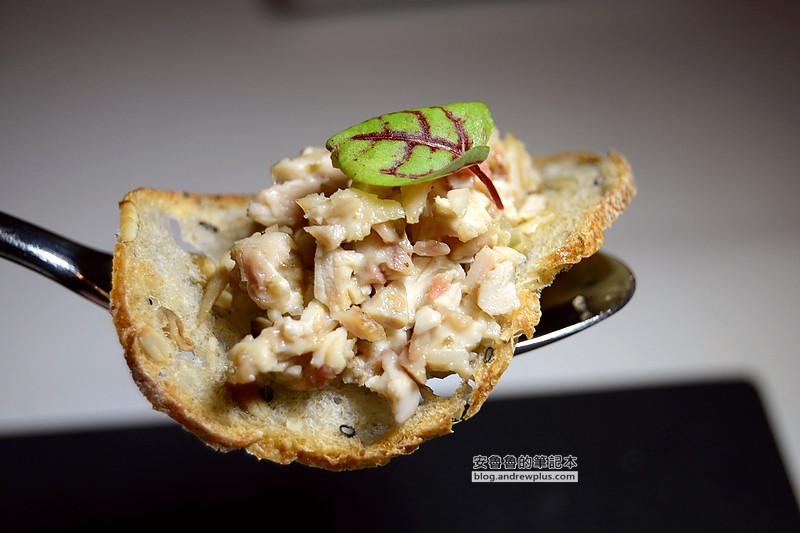 ▼雞肉沙拉的雞肉切成漂亮的小丁,而下面那一層薄薄的酥脆麵包,薄到已經可以稱為餅乾了,調味過的雞肉,搭配上酥脆的麵包餅(安魯魯發明的名稱),吃起來有香氣也有口感~堪稱是一個挑逗味蕾的小食