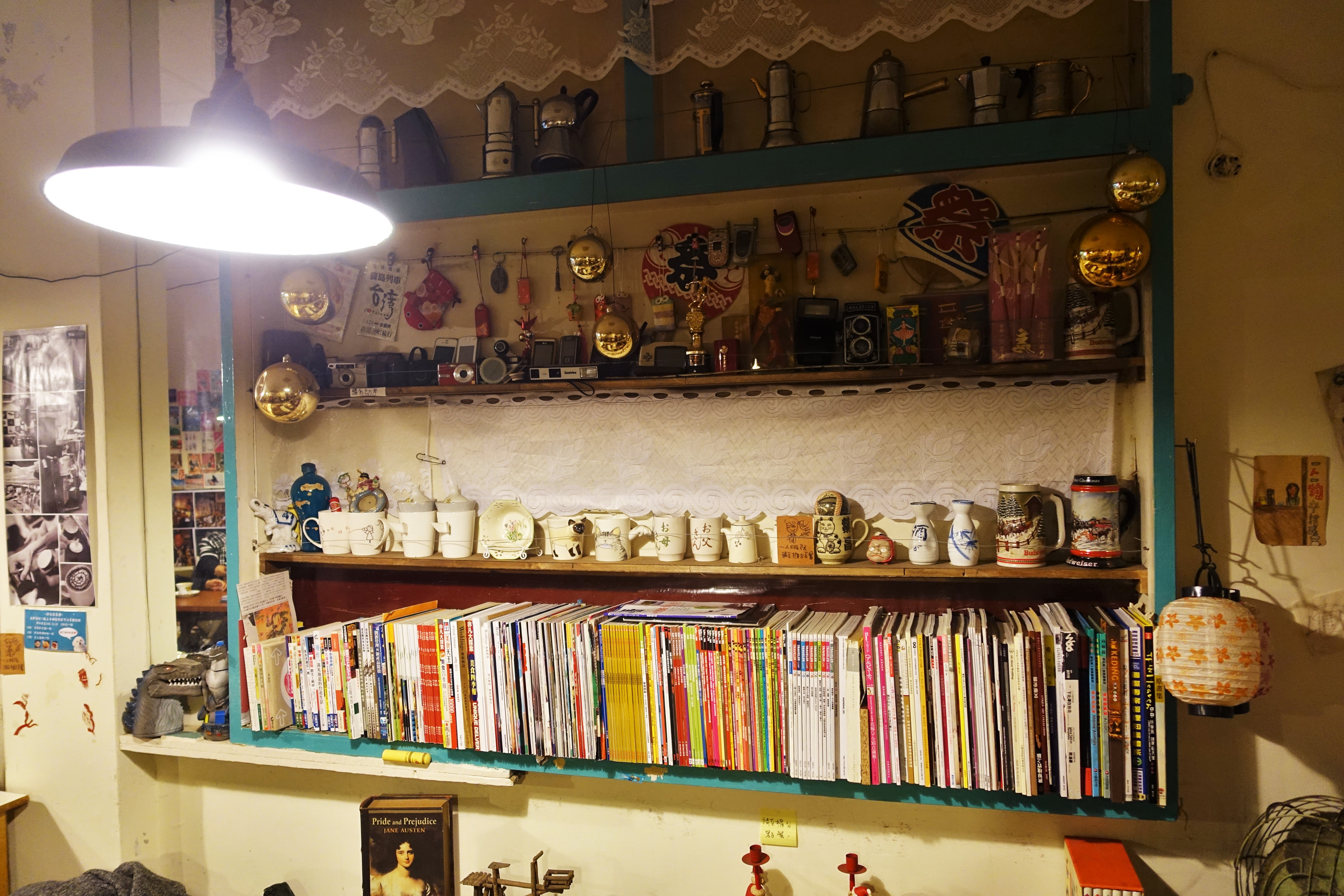 漫畫區的上方櫃子擺滿了像是從日本旅行買回來的杯子。