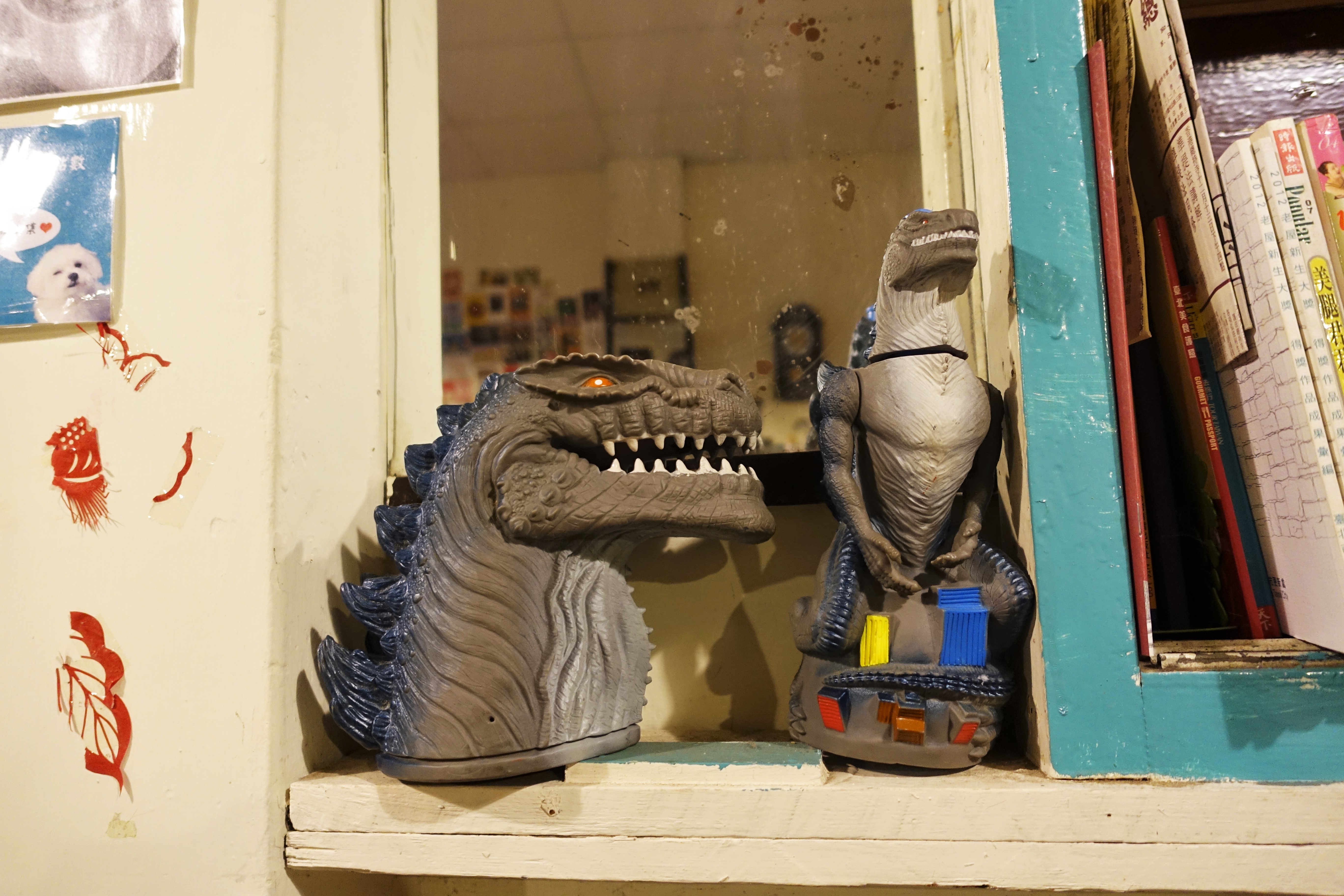 桌椅區旁邊的牆上放置著幾個大小玩偶。