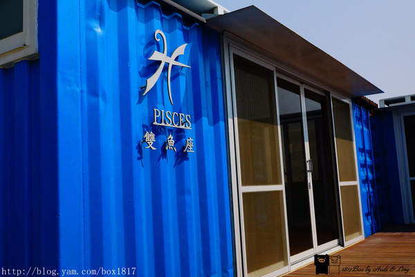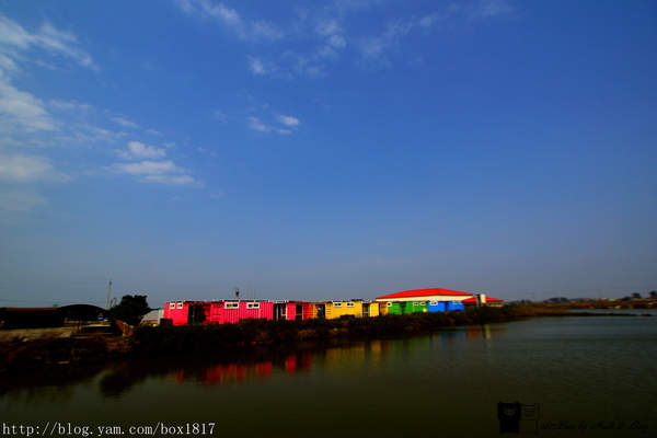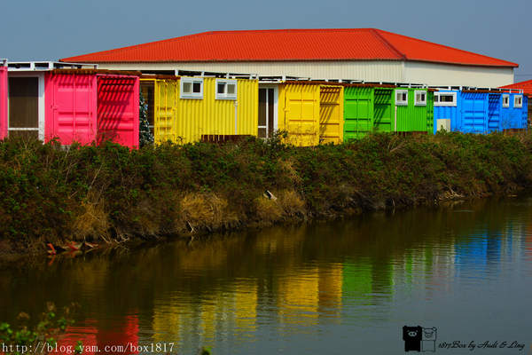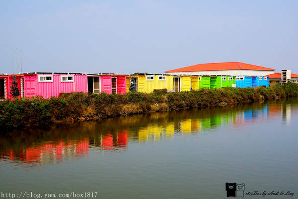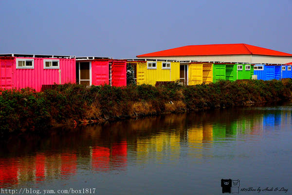 從彩色貨櫃屋的背面拍照才有倒影的效果,