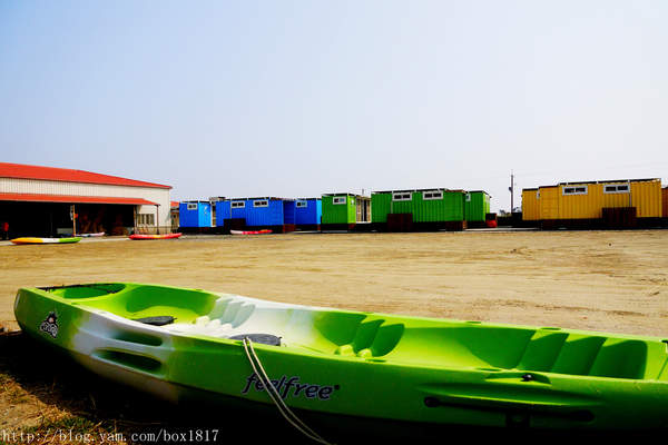 在園區裡的彩色屋前方擺放了各種不同顏色的獨木舟,