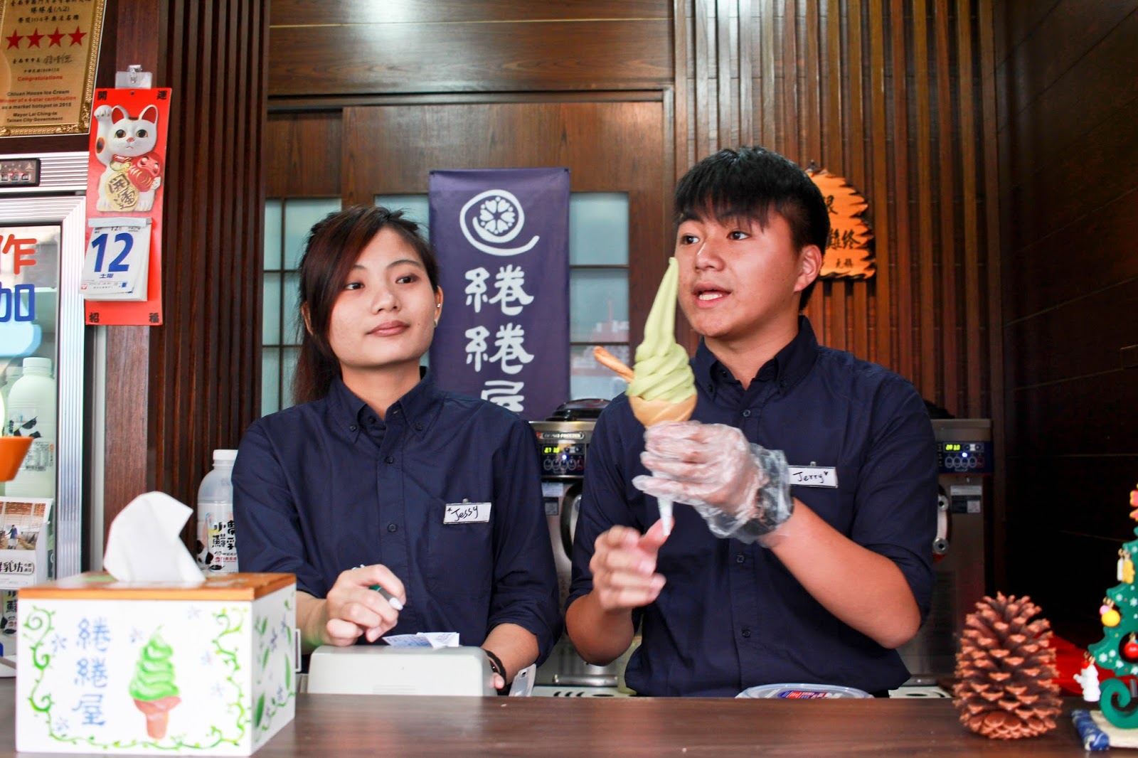 2015.12.12綣綣屋陽光恣意灑落空氣彌漫著溫暖的氣息前幾天台中寒風吹拂面對突然轉變的天氣還來不及換成輕薄的衣服走沒幾步路就開始汗流浹背在國華街遊走本來想吃小捲米粉一看到排這麼長直接放棄直接轉往小捲米粉對面排很多人的綣綣屋吃冰綣綣屋位於聚集眾多攤販的淺草新天地之中原來炸雞洋行也在這裡還有許多小攤販選擇太多不知從何下手朝著人群聚集的地方邁進小小的一家日式風格的店門外早已擠滿了等待的人群生意很好來之前一種口味已經賣光了[宇治抹茶]$80抹茶在舌尖緩緩化開飄出濃厚的茶香整體口感偏苦澀茶香四溢口感滑順如果再甜一點我會更尬意底層的甜筒餅乾吃起來酥酥脆脆的覺得綣綣屋服務相當不錯難怪會有絡繹不絕的人潮[綣綣屋地址:台南市中西區國華街三段26號]突然發現對面擠滿了人群原來是在排隊買現在最夯的小鮮肉奶茶張三瘋小鮮肉奶茶純路過....另一項景點大概就是著名的泰成水果行賣的哈密瓜冰加碼附贈大美女照片一張~謝謝觀賞~