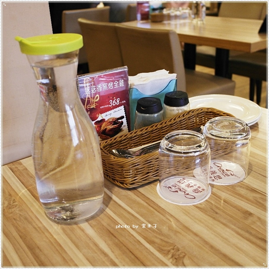 每張桌上都有水壺、水杯、調味罐和餐具,