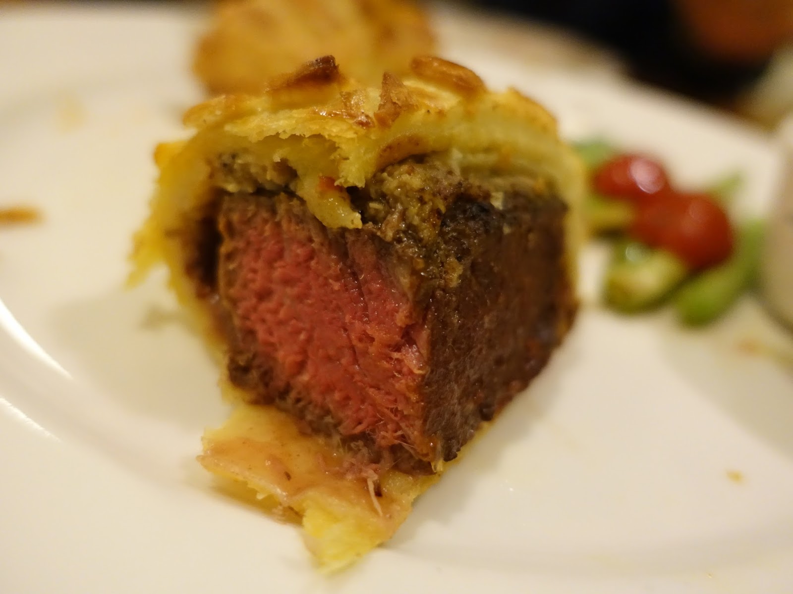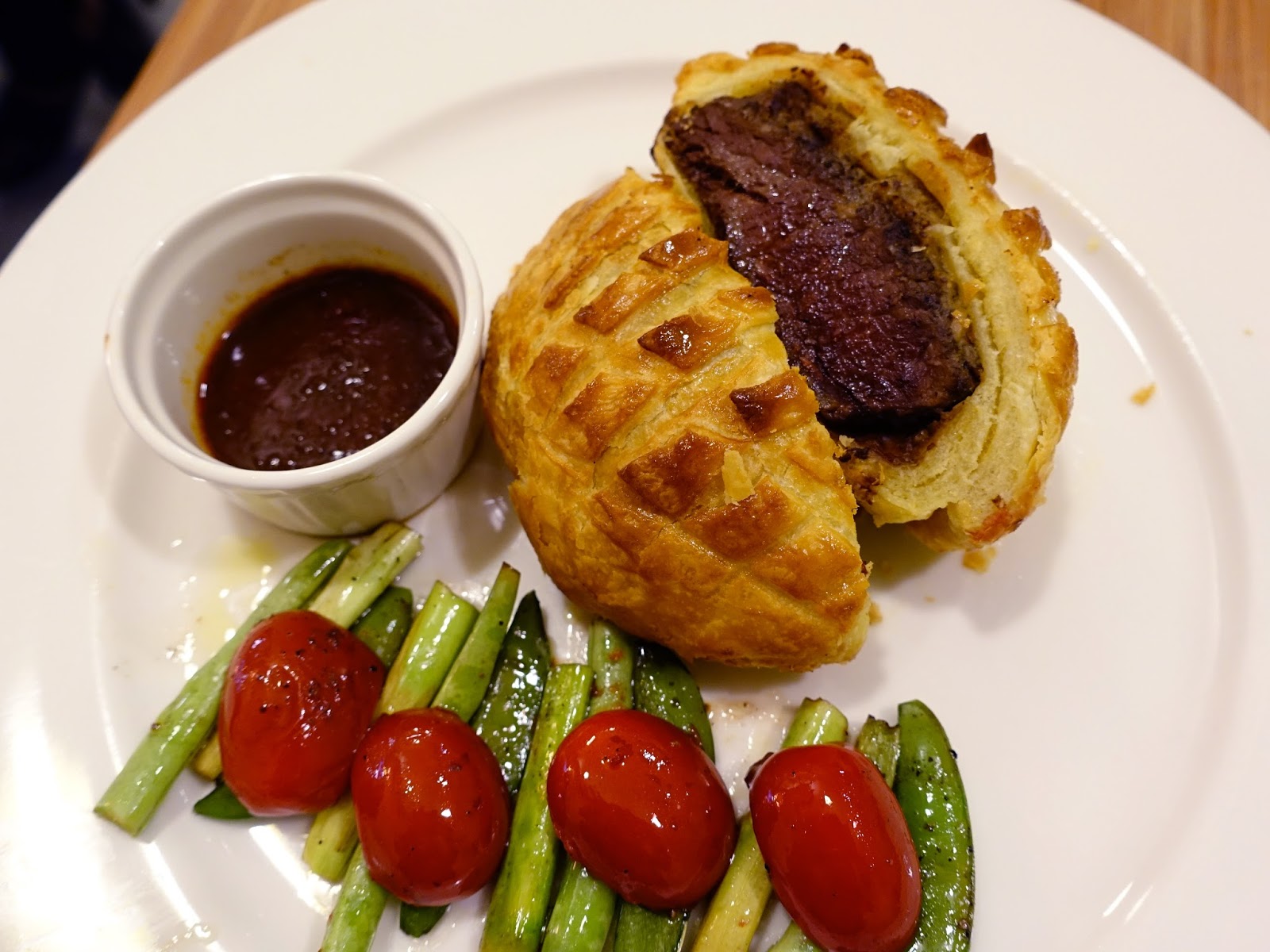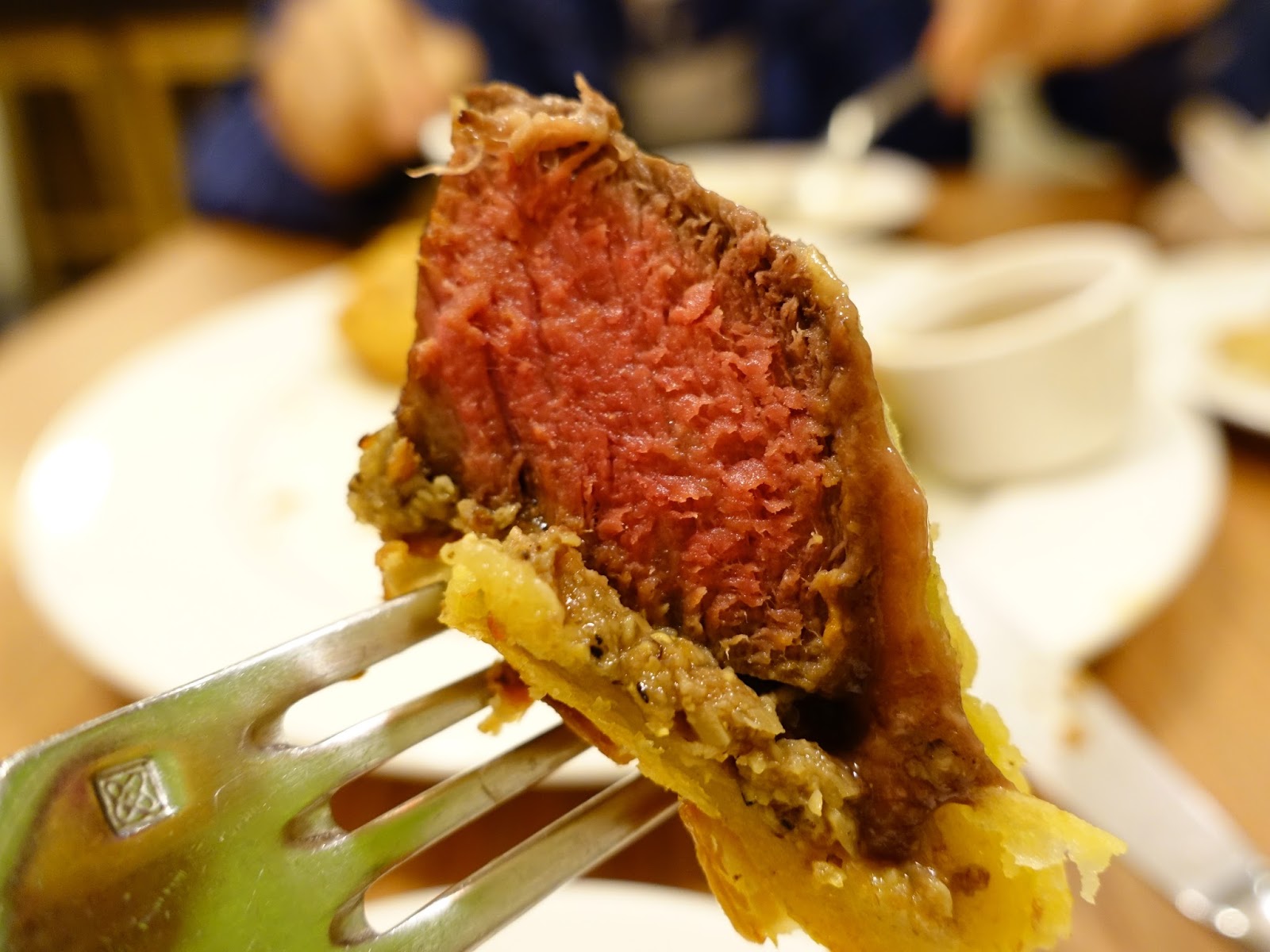 由於肉質精嫩,一刀劃下輕鬆地整齊切開這個酥皮與牛肉,趁熱吃讓人感到相當滿足。