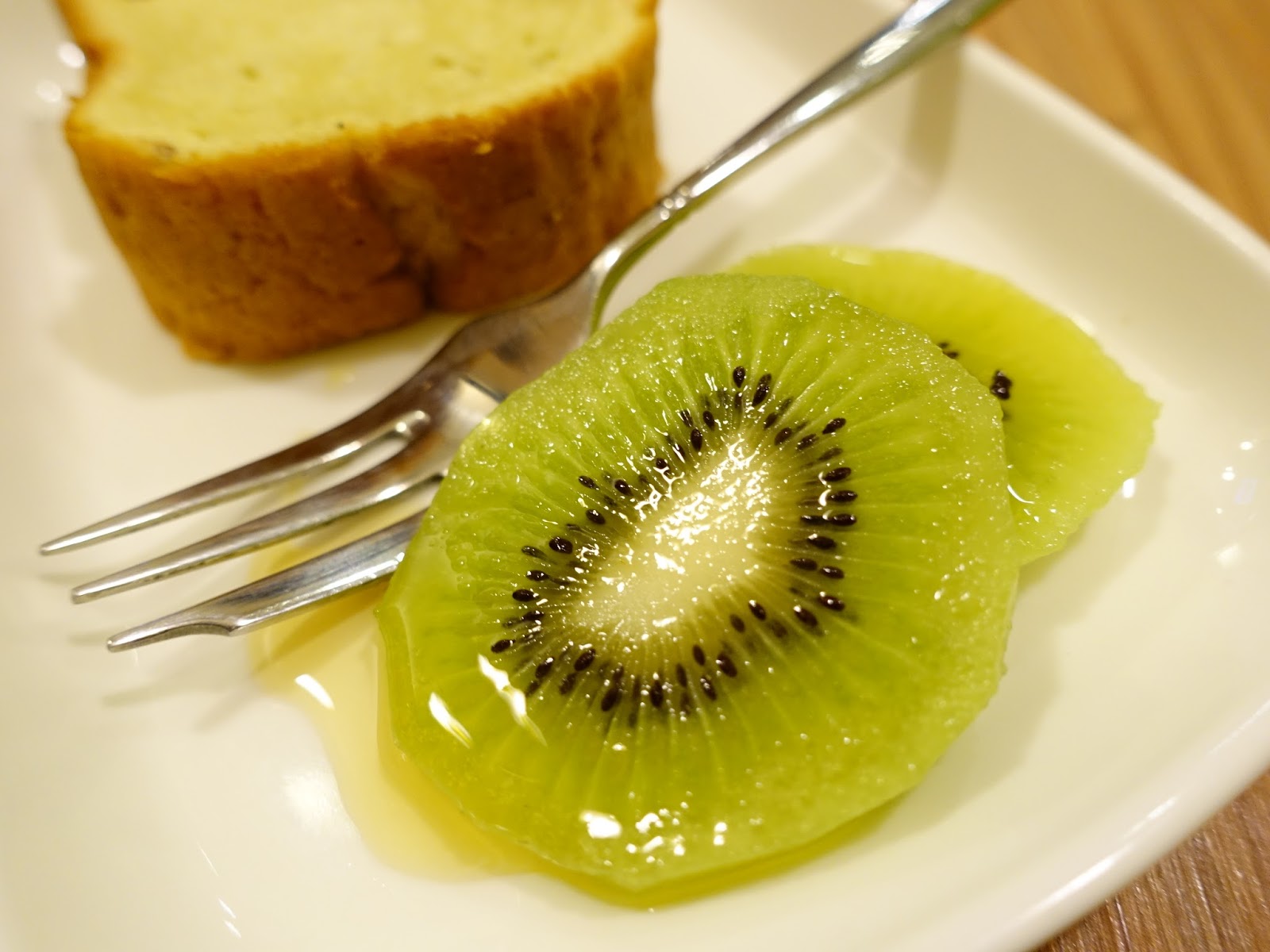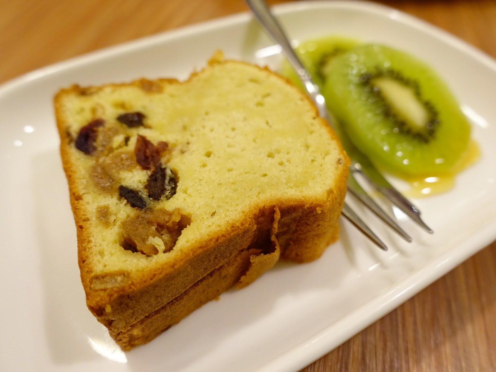 甜點以水果磅蛋糕與來自紐西蘭的奇異果收尾,可千萬別小看這份甜點,奇異果上細心的淋上蜂蜜,充滿水分的果香與甜美不在話下,餐廳自製的水果磅蛋糕,奶油控制得剛好,吃起來沒有太油膩而且糖漬水果口味天然,吃得出是自家糖漬而成的果乾,口感新鮮自然、甜度剛好。